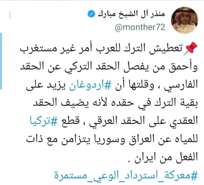 واعتبر في تغريدة على حسابه بموقع التدوين المصغر تويتر، اليوم أن: "تعطيش الترك للعرب أمر غير مستغرب وأحمق من يفصل الحقد التركي عن الحقد الفارسي".