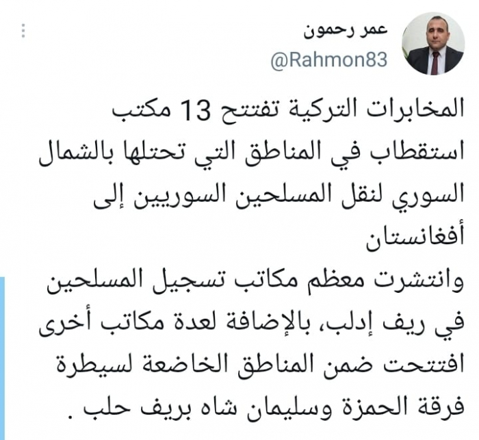 وأوضح في تغريدة على حسابه بموقع التدوين المصغر تويتر، اليوم أن: "المخابرات التركية تفتتح 13 مكتب استقطاب في المناطق التي تحتلها بالشمال السوري لنقل المسلحين السوريين إلى أفغانستان".