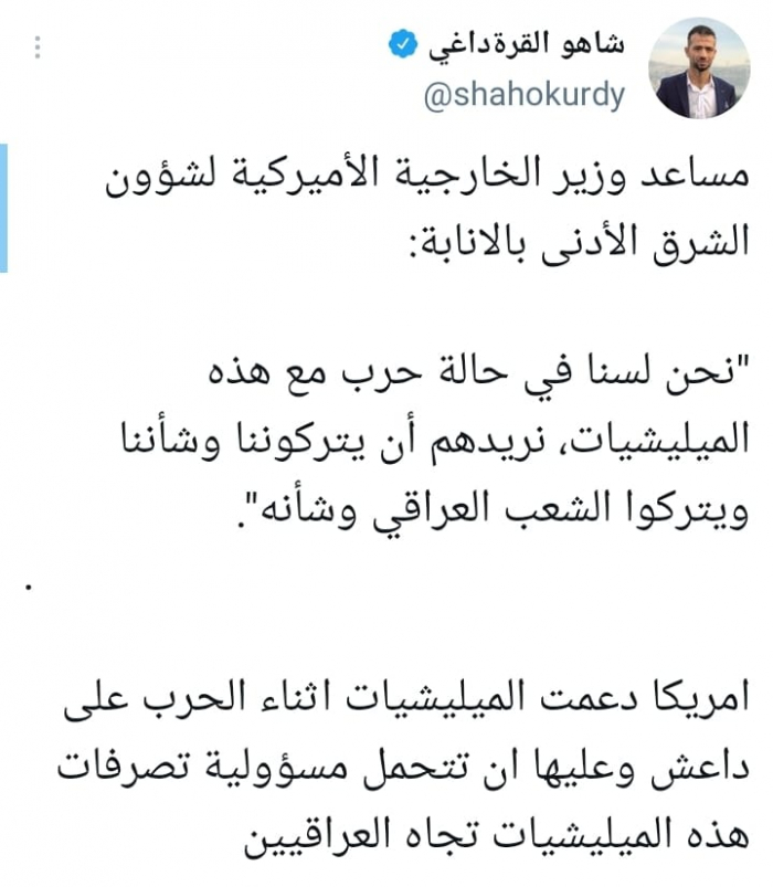 ونقل في تغريدة على حسابه بموقع التدوين المصغر تويتر، اليوم عن: "مساعد وزير الخارجية الأميركية لشؤون الشرق الأدنى بالانابة: "نحن لسنا في حالة حرب مع هذه الميليشيات، نريدهم أن يتركوننا وشأننا ويتركوا الشعب العراقي وشأنه".