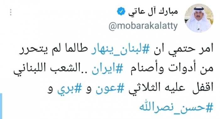 آل عاتي: انهيار لبنان محتوم تحت سيطرة مليشيات حزب الله
