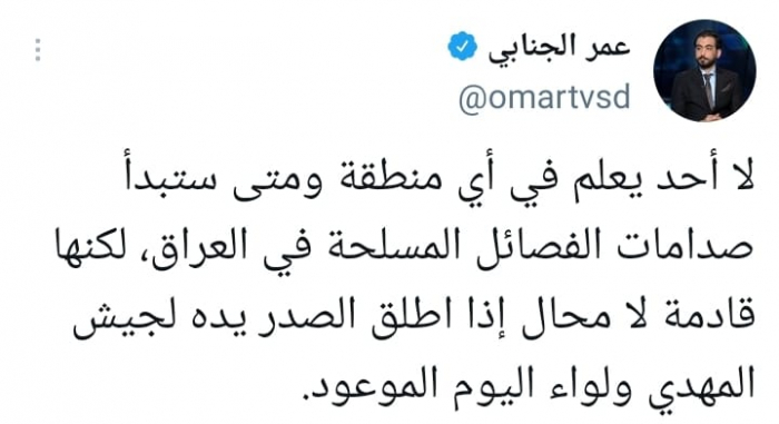 وأشار في تغريدة على حسابه بموقع التدوين المصغر تويتر، اليوم إلى أن: "لا أحد يعلم في أي منطقة ومتى ستبدأ صدامات الفصائل المسلحة في العراق".