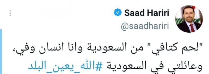 وقال في تغريدة على حسابه بموقع التدوين المصغر تويتر، اليوم إن: "(لحم كتافي) من السعودية وأنا إنسان وفي، وعائلتي في السعودية"، مختتما بهاشتاج: "الله يعين البلد".