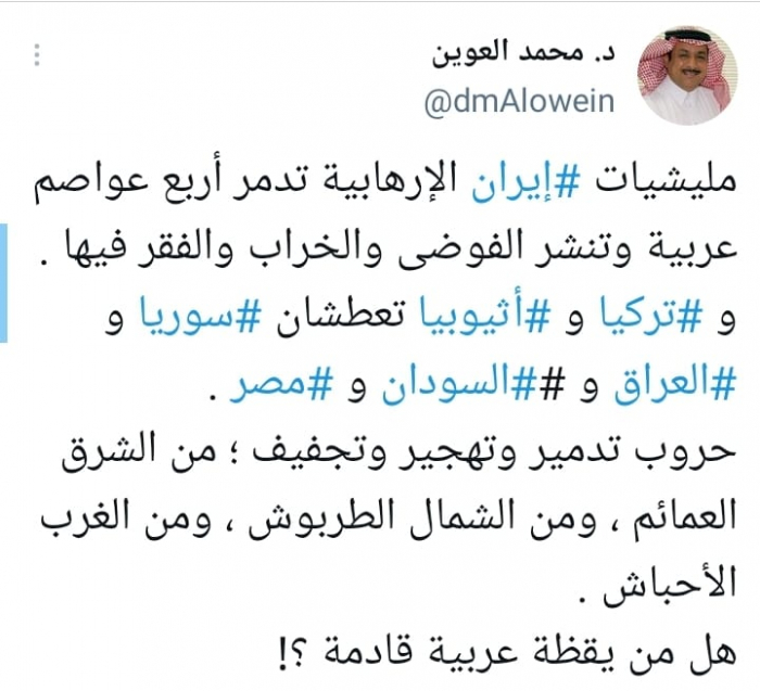 العوين يدعو ليقظة عربية أمام مخططات تركيا وإيران