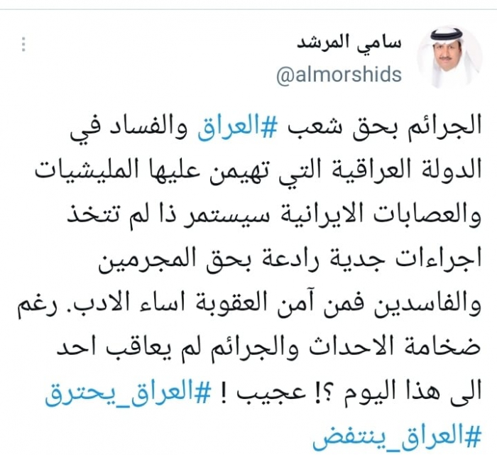 وأوضح في تغريدة على حسابه بموقع التدوين المصغر تويتر، اليوم أن: "الجرائم بحق شعب العراق والفساد في الدولة العراقية التي تهيمن عليها المليشيات والعصابات الإيرانية سيستمر إذا لم تتخذ إجراءات جدية رادعة بحق المجرمين والفاسدين فمن آمن العقوبة أساء الأدب".