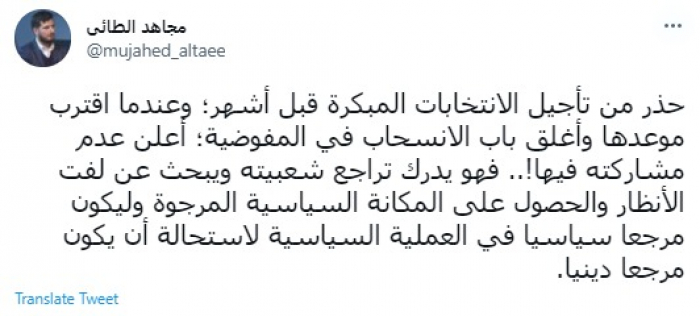 وقال في تغريدة عبر "تويتر" رصدها "المشهد العربي": "حذر من تأجيل الانتخابات المبكرة قبل أشهر؛ وعندما اقترب موعدها وأغلق باب الانسحاب في المفوضية؛ أعلن عدم مشاركته فيها".