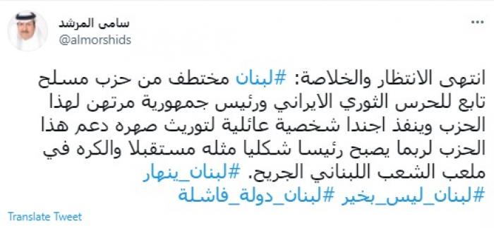 وكتب في تغريدة عبر "تويتر" رصدها "المشهد العربي": "انتهى الانتظار والخلاصة: لبنان مختطف من حزب مسلح تابع للحرس الثوري الإيراني ورئيس جمهورية مرتهن لهذا الحزب".