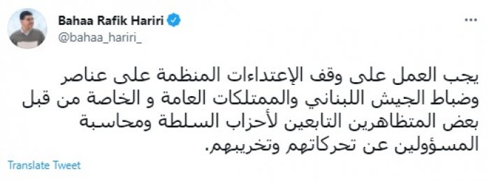 دعا السياسي اللبناني البارز بهاء الحريري، اليوم الجمعة، أحزاب السلطة اللبنانية لوقف الاعتداءات المنظمة على ضباط الجيش اللبناني.