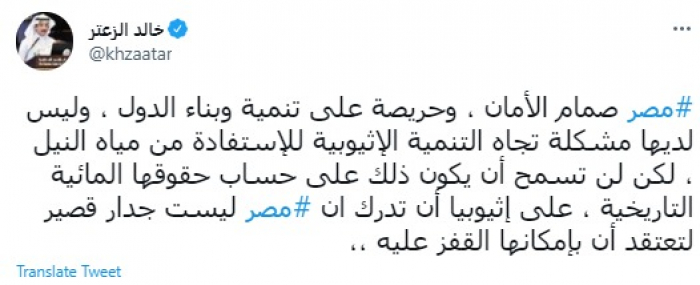 وقال في تغريدات عبر "تويتر" رصدها "المشهد العربي": "تابعت وبشغف كلمة الرئيس المصري عبد الفتاح السيسي ، حملت معها تأكيد بأن مصر لايليق بها أن تقلق ، وأنها قادرة على الحفاظ على مصالحها وحقوقها المائية ، يجب أن تستوعب المغامرات الإثيوبية هذه الكلمات جيداً".