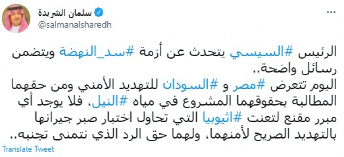 وقال في تغريدة عبر "تويتر" رصدها "المشهد العربي": "الرئيس السيسي يتحدث عن أزمة سد النهضة ويتضمن رسائل واضحة.. اليوم تتعرض مصر و السودان للتهديد الأمني ومن حقهما المطالبة بحقوقهما المشروع في مياه النيل".
