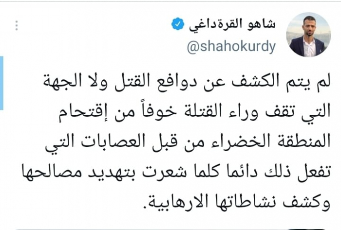 استنكر الكاتب الصحفي شاهو قرة داغي، تجاهل السلطات العراقية إعلان دوافع قتلة الباحث هشام الهاشمي، من الجريمة، خلال إذاعتها الاعترافات المصورة للجناة، مرجحا أنها خشية من شغل المليشيات الموالية لإيران.