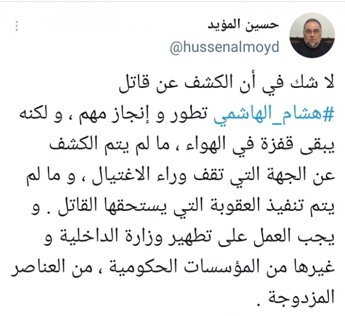 وأكد في تغريدة على حسابه بموقع التدوين المصغر تويتر، اليوم أنه: "لا شك في أن الكشف عن قاتل هشام الهاشمي تطور وإنجاز مهم، و لكنه يبقى قفزة في الهواء، ما لم يتم الكشف عن الجهة التي تقف وراء الاغتيال وما لم يتم تنفيذ العقوبة التي يستحقها القاتل".