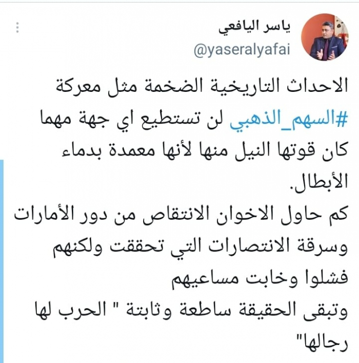 أكد الكاتب الصحفي ياسر اليافعي، أن معركة السهم الذهبي لتحرير العاصمة عدن، من المراحل التاريخية التي تستعصي على التشويه، مشيرا إلى محاولات تنظيم الإخوان الإرهابي تحريف حقيقتها.