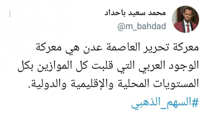 اعتبر الناشط السياسي محمد سعيد باحداد، أن تحرير العاصمة عدن، معركة بدلت المشهد على المستويين الإقليمي والمحلي.