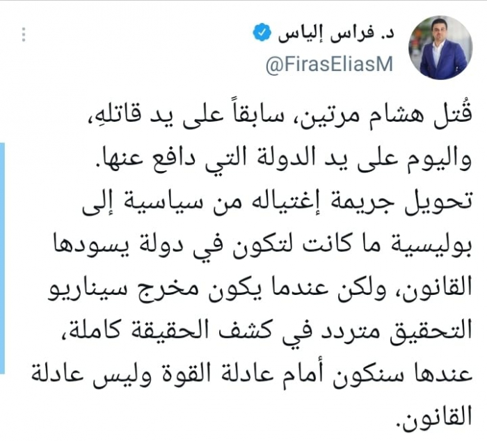 وأوضح في تغريدة على حسابه بموقع التدوين المصغر تويتر، اليوم أنه: "قُتل هشام مرتين، سابقا على يد قاتله، واليوم على يد الدولة التي دافع عنها".