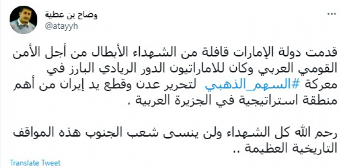 وقال في تغريدة عبر "تويتر" رصدها "المشهد العربي": "قدمت دولة الإمارات قافلة من الشهداء الأبطال من أجل الأمن القومي العربي وكان للإماراتيون الدور الريادي البارز في معركة السهم الذهبي لتحرير عدن وقطع يد إيران من أهم منطقة استراتيجية في الجزيرة العربية".