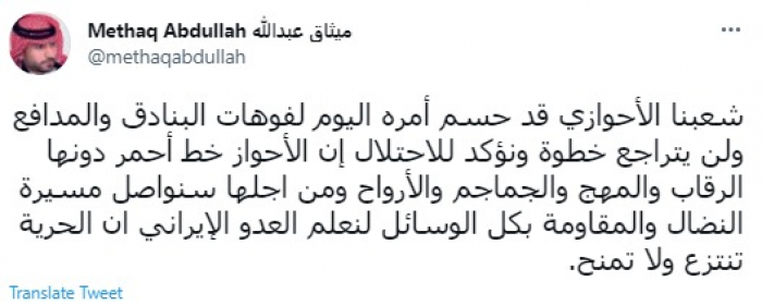 وكتب في تغريدة عبر "تويتر" رصدها "المشهد العربي": "شعبنا الأحوازي قد حسم أمره اليوم لفوهات البنادق والمدافع ولن يتراجع خطوة".