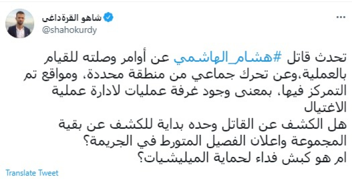 وقال في تغريدة عبر "تويتر" رصدها "المشهد العربي": "تحدث قاتل هشام الهاشمي عن أوامر وصلته للقيام بالعملية، وعن تحرك جماعي من منطقة محددة، ومواقع تم التمركز فيها، بمعنى وجود غرفة عمليات لإدارة عملية الاغتيال".
