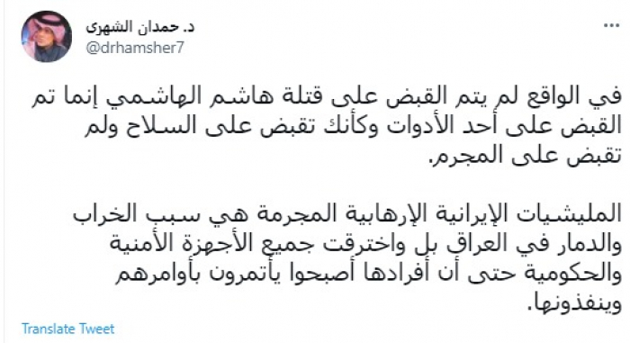 وكتب في تغريدة عبر "تويتر" رصدها "المشهد العربي": "في الواقع لم يتم القبض على قتلة هاشم الهاشمي إنما تم القبض على أحد الأدوات وكأنك تقبض على السلاح ولم تقبض على المجرم".