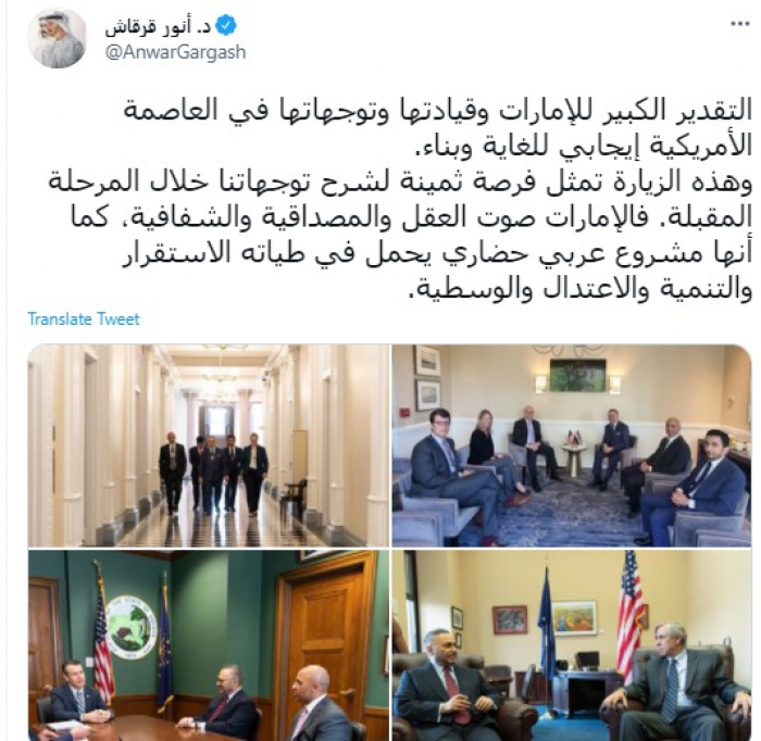 وقال في تغريدة عبر "تويتر" رصدها "المشهد العربي": "التقدير الكبير للإمارات وقيادتها وتوجهاتها في العاصمة الأمريكية إيجابي للغاية وبناء".