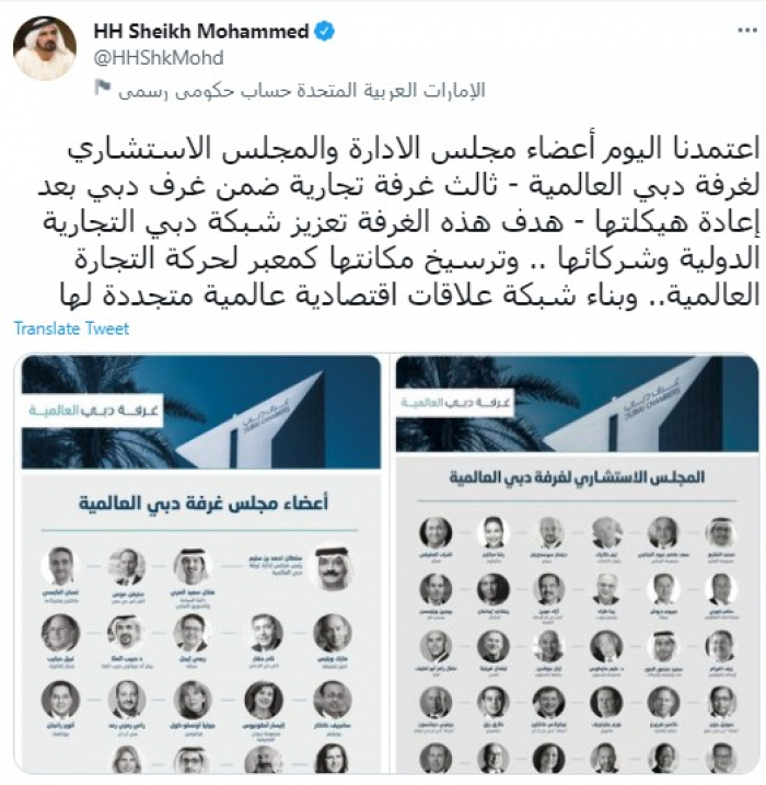 وقال في تغريدة عبر "تويتر" رصدها "المشهد العربي": "اعتمدنا اليوم أعضاء مجلس الادارة والمجلس الاستشاري لغرفة دبي العالمية - ثالث غرفة تجارية ضمن غرف دبي بعد إعادة هيكلتها – ".