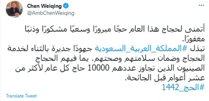 وأضاف: "تبذل المملكة العربية السعودية جهودًا جديرة بالثناء لخدمة الحجاج وضمان سلامتهم وصحتهم، بما فيهم الحجاج الصينيون الذين تجاوز عددهم 10000 حاج كل عام لأكثر من عشر أعوام قبل الجائحة".