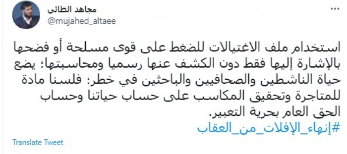 وقال في تغريدة عبر "تويتر" رصدها "المشهد العربي": "استخدام ملف الاغتيالات للضغط على قوى مسلحة أو فضحها بالإشارة إليها فقط دون الكشف عنها رسميًا ومحاسبتها؛ يضع حياة الناشطين والصحافيين والباحثين في خطر؛ فلسنا مادة للمتاجرة وتحقيق المكاسب على حساب حياتنا وحساب الحق العام بحرية التعبير".