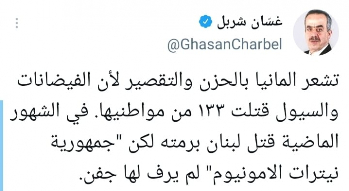عبر الكاتب الصحفي غسان شربل، عن أسفه للواقع في لبنان، مشيرا إلى حالة الحزن في ألمانيا لسقوط ضحايا في الفيضانات، بينما يعيش لبنان حالة من الانهيار من القوى الموازية للدولة ممثلة بمليشيات حزب الله الموالية لإيران، عقب انفجار مرفأ بيروت.
