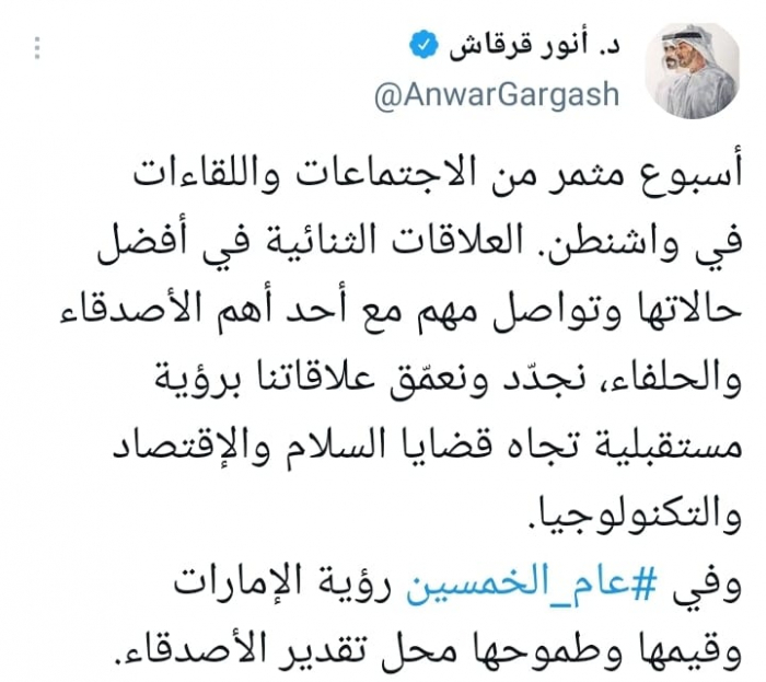 وتابع: "وفي عام الخمسين رؤية الإمارات وقيمها وطموحها محل تقدير الأصدقاء".