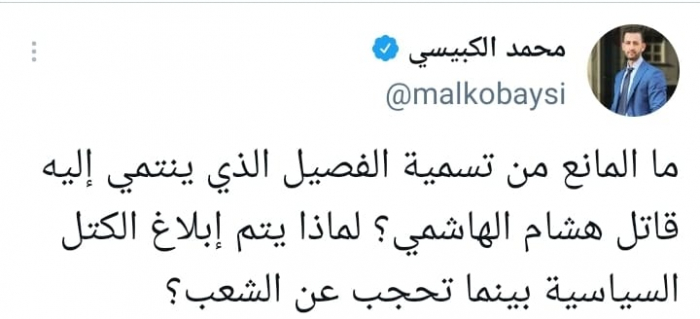 وتساءل في تغريدة على حسابه بموقع التدوين المصغر تويتر، اليوم: "ما المانع من تسمية الفصيل الذي ينتمي إليه قاتل هشام الهاشمي؟ لماذا يتم إبلاغ الكتل السياسية بينما تحجب عن الشعب؟".