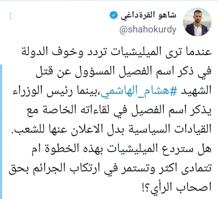 وقال في تغريدة على حسابه بموقع التدوين المصغر تويتر، اليوم إنه: "عندما ترى الميليشيات تردد وخوف الدولة في ذكر اسم الفصيل المسؤول عن قتل الشهيد هشام الهاشمي، بينما رئيس الوزراء يذكر اسم الفصيل في لقاءاته الخاصة مع القيادات السياسية بدل الإعلان عنها للشعب".