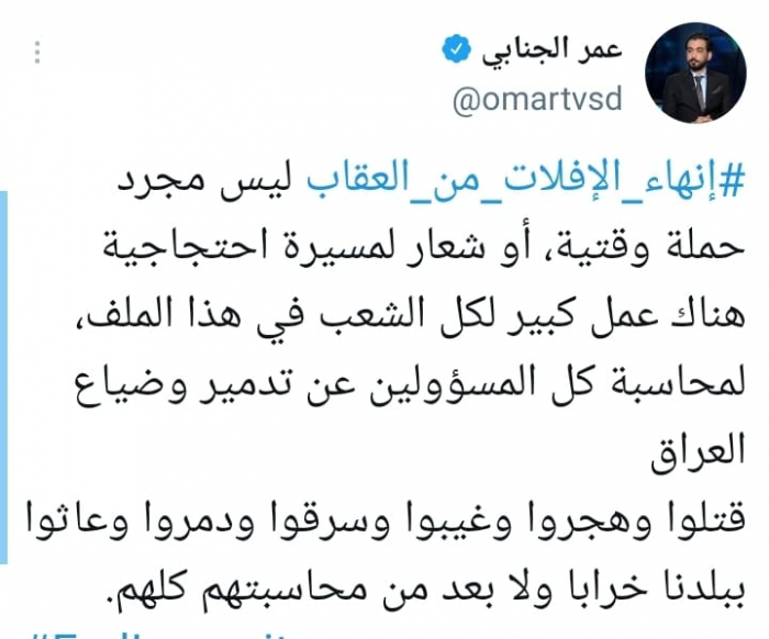 شدد الكاتب الصحفي عمر الجنابي، على أن إنهاء الإفلات من العقاب في العراق، مسؤولية شعبية، للتوصل إلى محاسبة كل المسؤولين عن التخريب والتدمير والسرقات.