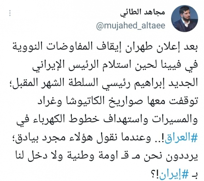أشار الكاتب الصحفي مجاهد الطائي إلى توقف المليشيات الموالية لإيران عن هجماتها على السفارات والقواعد العسكرية بالعراق، مع إعلان إيران إيقاف المفاوضات النووية في فيينا.