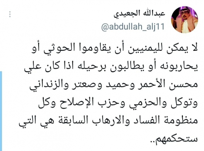 ولفت في تغريدة على حسابه بموقع التدوين المصغر تويتر، اليوم إلى أنه: "لا يمكن لليمنيين أن يقاوموا الحوثي أو يحاربونه أو يطالبون برحيله إذا كان علي محسن الأحمر وحميد وصعتر والزنداني وتوكل والحزمي وحزب الإصلاح وكل منظومة الفساد والارهاب السابقة هي التي ستحكمهم".