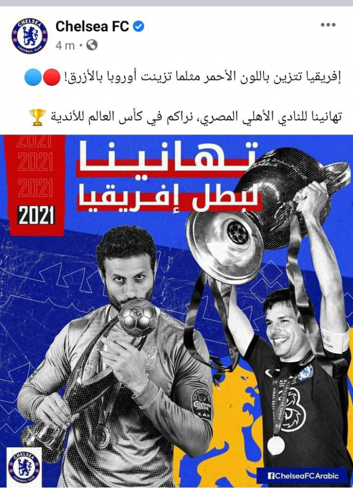 وكتب الفريق الإنجليزي عبر حسابه الرسمي على موقع التواصل الاجتماعي "فيسبوك": "إفريقيا تتزين باللون الأحمر مثلما تزينت أوروبا بالأزرق، تهانينا للنادي الأهلي المصري، نراكم في كأس العالم للأندية".