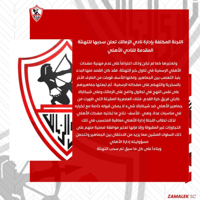 وأعلنت في بيان رسمي نشر عبر الموقع الرسمي للنادي، أنها تعتبر التهنئة كأنها لم تكن؛ اعتراضًا على عدم مهنية صفحات الأهلي الرسمية في تناول خبر التهنئة.