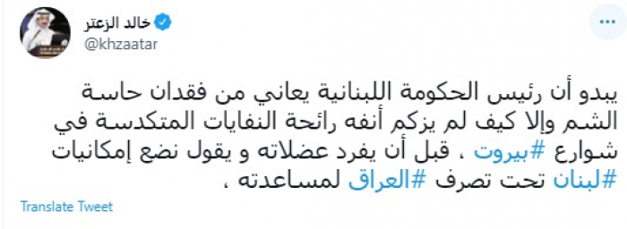 وقال في تغريدة عبر "تويتر" رصدها "المشهد العربي": "يبدو أن رئيس الحكومة اللبنانية يعاني من فقدان حاسة الشم وإلا كيف لم يزكم أنفه رائحة النفايات المتكدسة في شوارع بيروت".
