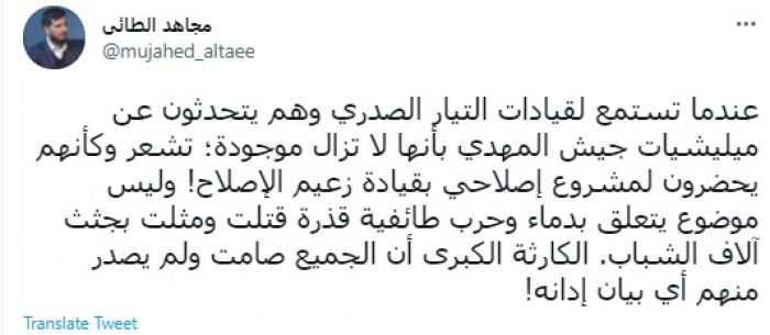 وقال في تغريدة عبر "تويتر" رصدها "المشهد العربي": "عندما تستمع لقيادات التيار الصدري وهم يتحدثون عن ميليشيات جيش المهدي بأنها لا تزال موجودة؛ تشعر وكأنهم يحضرون لمشروع إصلاحي بقيادة زعيم الإصلاح وليس موضوع يتعلق بدماء وحرب طائفية قذرة قتلت ومثلت بجثث آلاف الشباب".