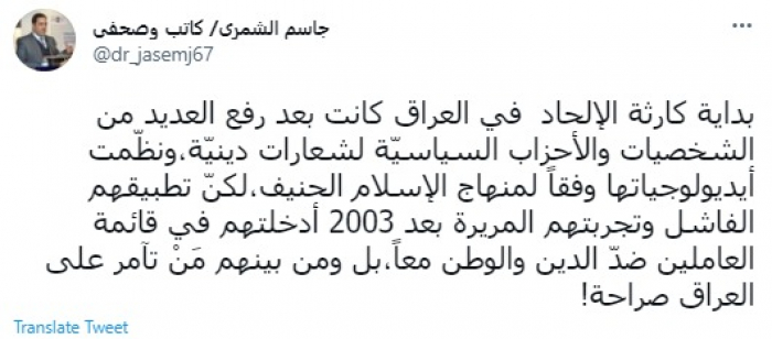 وقال في تغريدة عبر "تويتر" رصدها "المشهد العربي": "بداية كارثة الإلحاد في العراق كانت بعد رفع العديد من الشخصيات والأحزاب السياسيّة لشعارات دينيّة،ونظّمت أيديولوجياتها وفقاً لمنهاج الإسلام الحنيف".