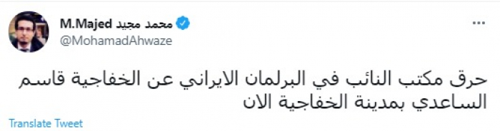 وقال في تغريدة عبر "تويتر" رصدها "المشهد العربي": "حرق مكتب النائب في البرلمان الإيراني عن الخفاجية قاسم الساعدي بمدينة الخفاجية الآن".