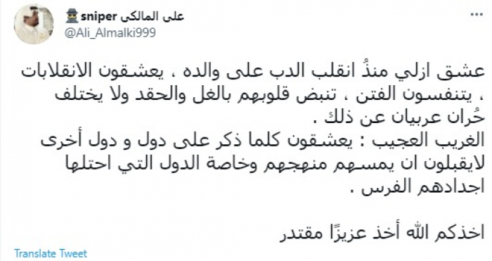 وقال في تغريدة عبر "تويتر" رصدها "المشهد العربي": "عشق أزلي منذُ انقلب الدب على والده، يعشقون الانقلابات ، يتنفسون الفتن ، تنبض قلوبهم بالغل والحقد ولا يختلف حُران عربيان عن ذلك".