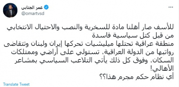 وأضاف: "منطقة عراقية تحتلها ميليشيات تحركها إيران ولبنان وتتقاضى رواتبها من الدولة العراقية، تستولي على أراضي وممتلكات السكان، وفوق كل ذلك يأتي التلاعب السياسي بمشاعر الأهالي أي نظام حكم مجرم هذا؟".