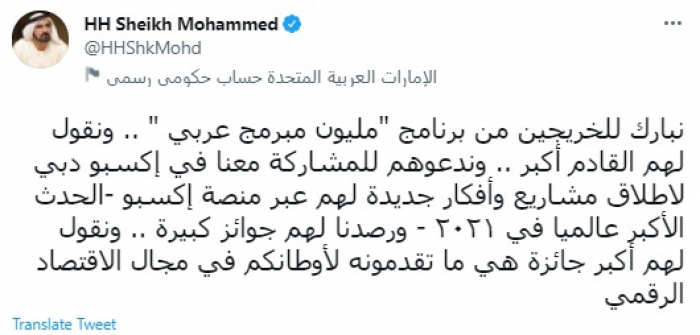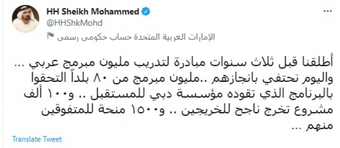 وقال في تغريدات عبر "تويتر" رصدها "المشهد العربي": "أطلقنا قبل ثلاث سنوات مبادرة لتدريب مليون مبرمج عربي … واليوم نحتفي بانجازهم ..مليون مبرمج من ٨٠ بلداً التحقوا بالبرنامج الذي تقوده مؤسسة دبي للمستقبل .. و١٠٠ ألف مشروع تخرج ناجح للخريجين .. و١٥٠٠ منحة للمتفوقين منهم".