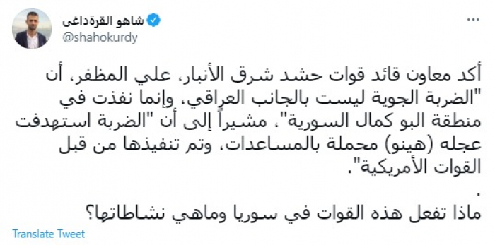 وقال في تغريدة عبر "تويتر" رصدها "المشهد العربي": "أكد معاون قائد قوات حشد شرق الأنبار، علي المظفر، أن الضربة الجوية ليست بالجانب العراقي، وإنما نفذت في منطقة البو كمال السورية"، مشيراً إلى أن الضربة استهدفت عجله (هينو) محملة بالمساعدات، وتم تنفيذها من قبل القوات الأمريكية".