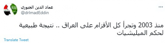 وقال في تغريدة عبر "تويتر" رصدها "المشهد العربي": " منذ 2003 وتجرأ كل الأقزام على العراق.. نتيجة طبيعية لحكم الميليشيات".