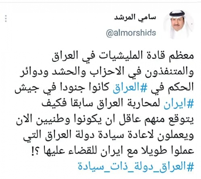 وقال في تغريدة عبر "تويتر" رصدها "المشهد العربي": "معظم قادة المليشيات في العراق والمتنفذون في الأحزاب والحشد ودوائر الحكم في العراق كانوا جنودا في جيش إيران لمحاربة العراق سابقا ".