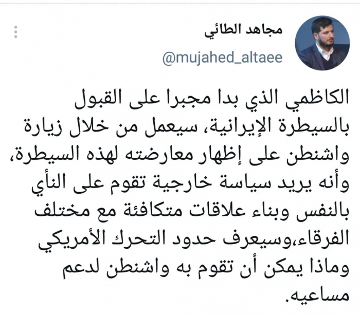 وقال في تغريدة عبر "تويتر" رصدها "المشهد العربي": "الكاظمي الذي بدا مجبرا على القبول بالسيطرة الإيرانية، سيعمل من خلال زيارة واشنطن على إظهار معارضته لهذه السيطرة، وأنه يريد سياسة خارجية تقوم على النأي بالنفس وبناء علاقات متكافئة مع مختلف الفرقاء".