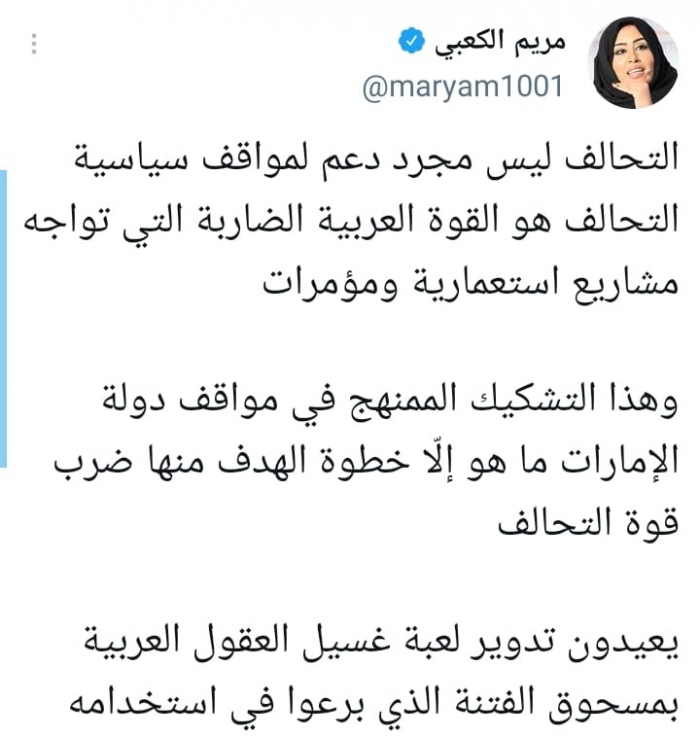 حذرت الكاتبة الصحفية مريم الكعبي من أهداف التشكيك في مواقف دولة الإمارات العربية المتحدة، معتبرة أنها محاولة لاستهداف التحالف العربي نفسه.