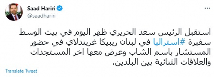 وقال في تغريدة عبر "تويتر" رصدها "المشهد العربي": "استقبلت ظهر اليوم في بيت الوسط سفيرة استراليا في لبنان ريبيكا غريندلاي في حضور المستشار باسم الشاب وعرض معها آخر المستجدات والعلاقات الثنائية بين البلدين".