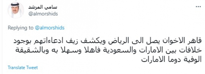 وقال في تغريدة عبر "تويتر" رصدها "المشهد العربي": "قاهر الإخوان يصل إلى الرياض ويكشف زيف إدعاءاتهم بوجود خلافات بين الامارات والسعودية فأهلا وسهلا به وبالشقيقة الوفية دوما الإمارات".