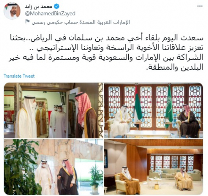 وقال في تغريدة عبر "تويتر" رصدها "المشهد العربي": "سعدت اليوم بلقاء أخي محمد بن سلمان في الرياض..بحثنا تعزيز علاقاتنا الأخوية الراسخة وتعاوننا الاستراتيجي .. الشراكة بين الإمارات والسعودية قوية ومستمرة لما فيه خير البلدين والمنطقة".